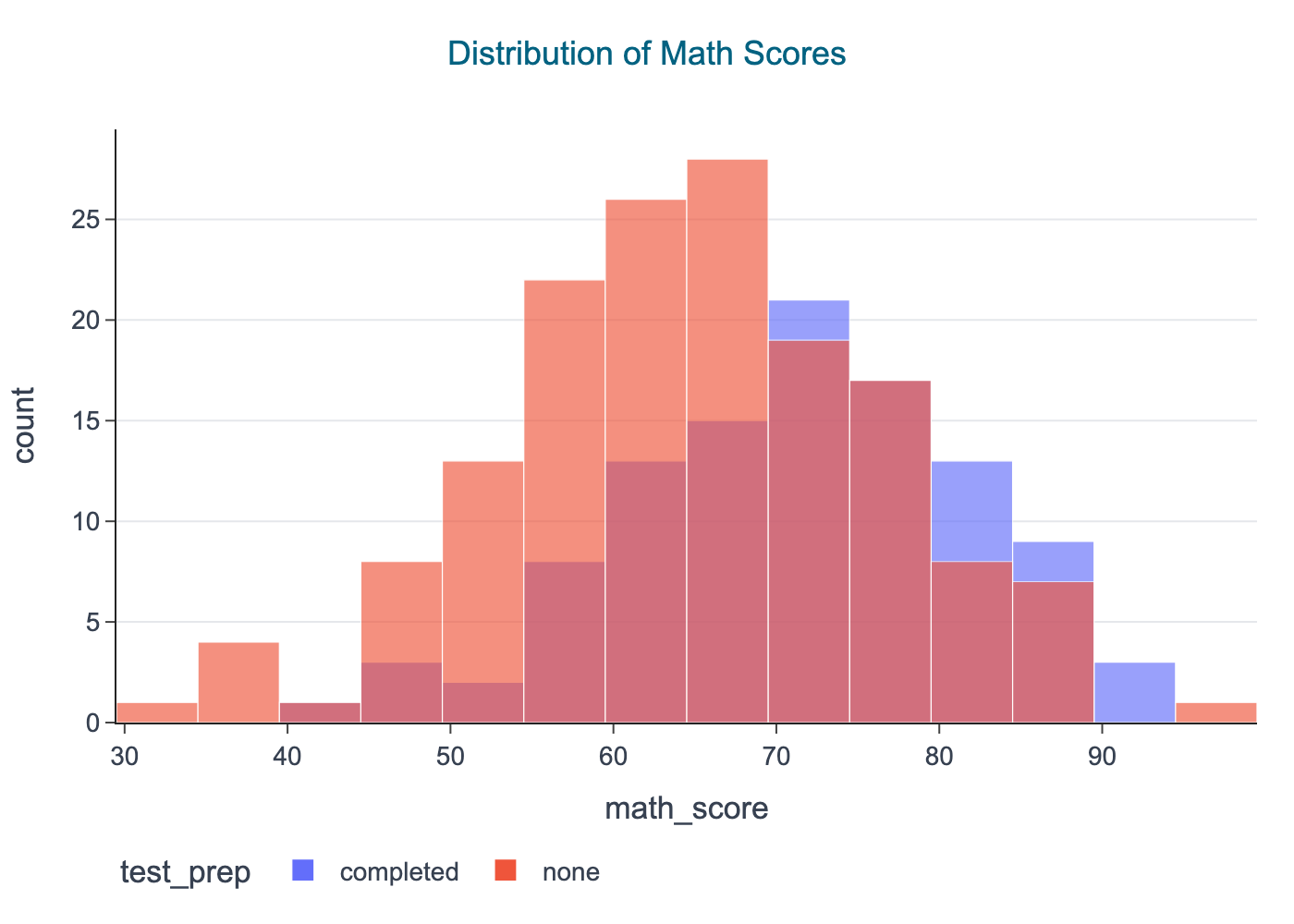 fig = px.histogram( df, x="math_score", color="test_prep", barmode="overlay", opacity=0.65, nbins=30, title="Distribution of Math Scores",)cdi_theme(fig, title_x=0.5)# Book rendering: save PNG only (no interactive output)show_and_save_plotly(fig, show=False) # figures/06_002.png