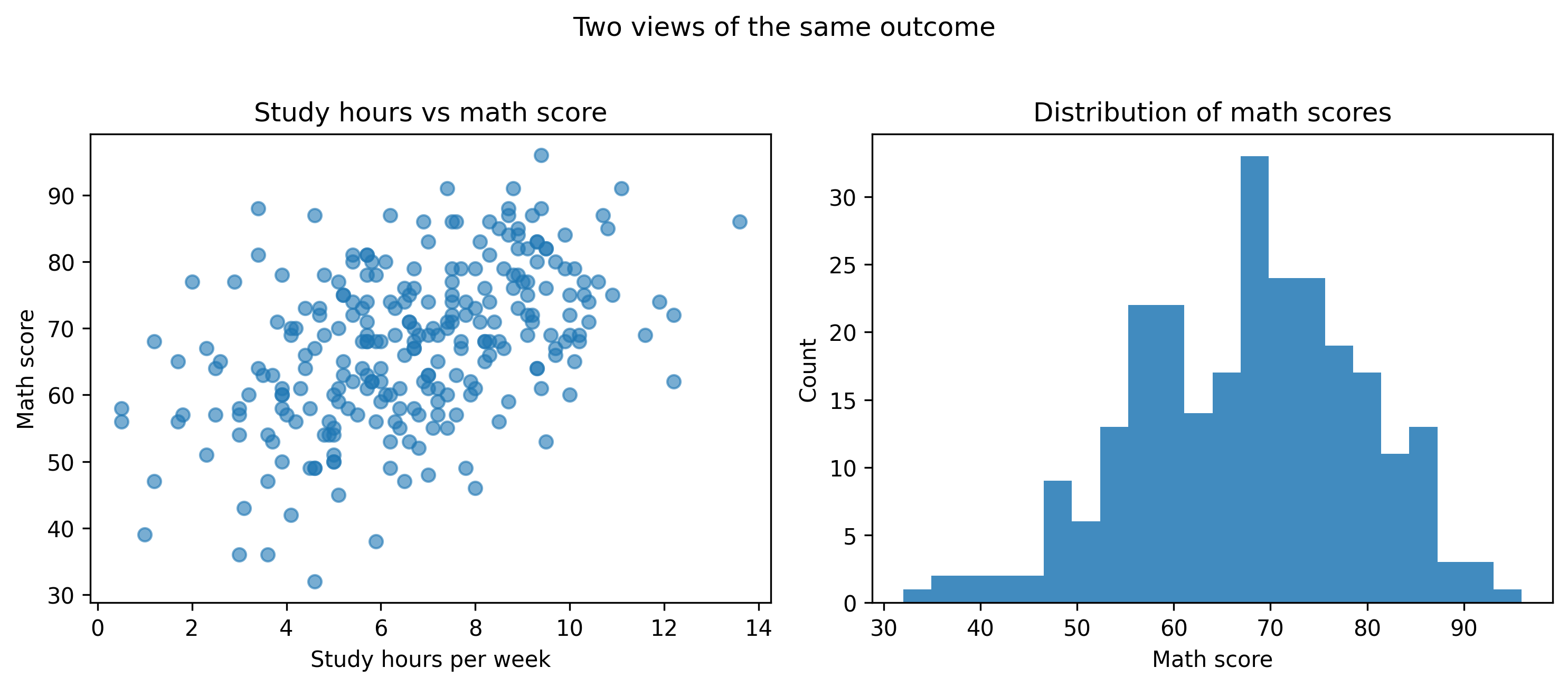 fig, axes = plt.subplots(ncols=2, figsize=(10, 4.2))# Panel 1: scatteraxes[0].scatter(df["study_hours"], df["math_score"], alpha=0.6)axes[0].set_title("Study hours vs math score")axes[0].set_xlabel("Study hours per week")axes[0].set_ylabel("Math score")# Panel 2: histogramaxes[1].hist(df["math_score"], bins=22, alpha=0.85)axes[1].set_title("Distribution of math scores")axes[1].set_xlabel("Math score")axes[1].set_ylabel("Count")fig.suptitle("Two views of the same outcome", y=1.02)fig.tight_layout()show_and_save_mpl(fig) # figures/07_001.png
