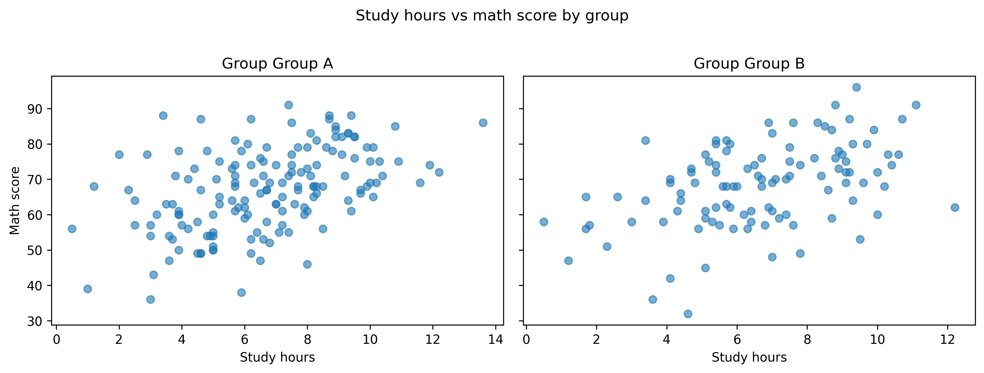 groups =sorted(df["group"].unique())fig, axes = plt.subplots(ncols=len(groups), figsize=(11, 4), sharey=True)for ax, g inzip(axes, groups): sub = df[df["group"] == g] ax.scatter(sub["study_hours"], sub["math_score"], alpha=0.6) ax.set_title(f"Group {g}") ax.set_xlabel("Study hours")axes[0].set_ylabel("Math score")fig.suptitle("Study hours vs math score by group", y=1.02)fig.tight_layout()show_and_save_mpl(fig) # figures/07_002.png