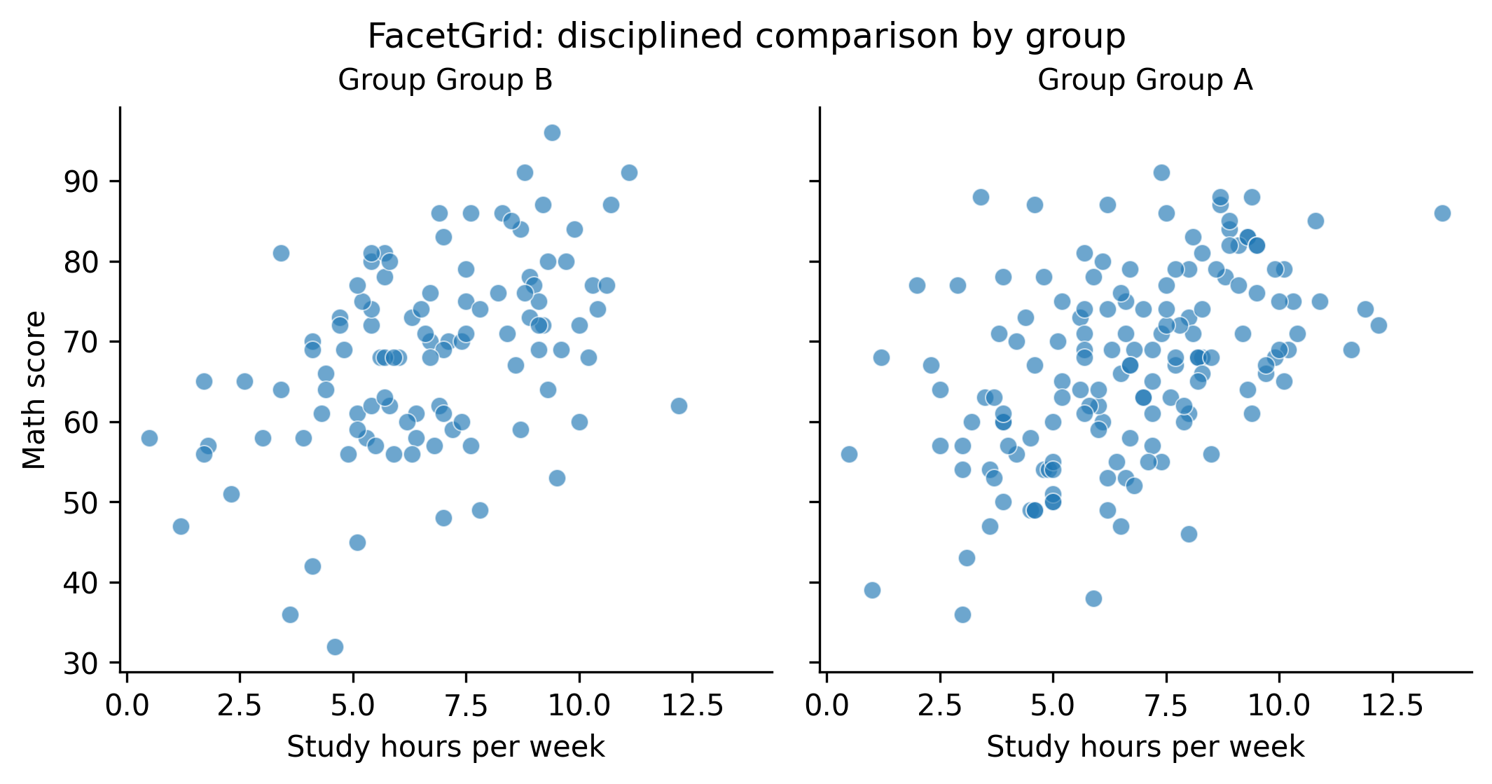 g = sns.FacetGrid(df, col="group", height=3.6, aspect=1.0, sharey=True)g.map_dataframe(sns.scatterplot, x="study_hours", y="math_score", alpha=0.65)g.set_axis_labels("Study hours per week", "Math score")g.set_titles("Group {col_name}")g.fig.suptitle("FacetGrid: disciplined comparison by group", y=1.02)show_and_save_mpl(g.fig) # figures/07_003.png