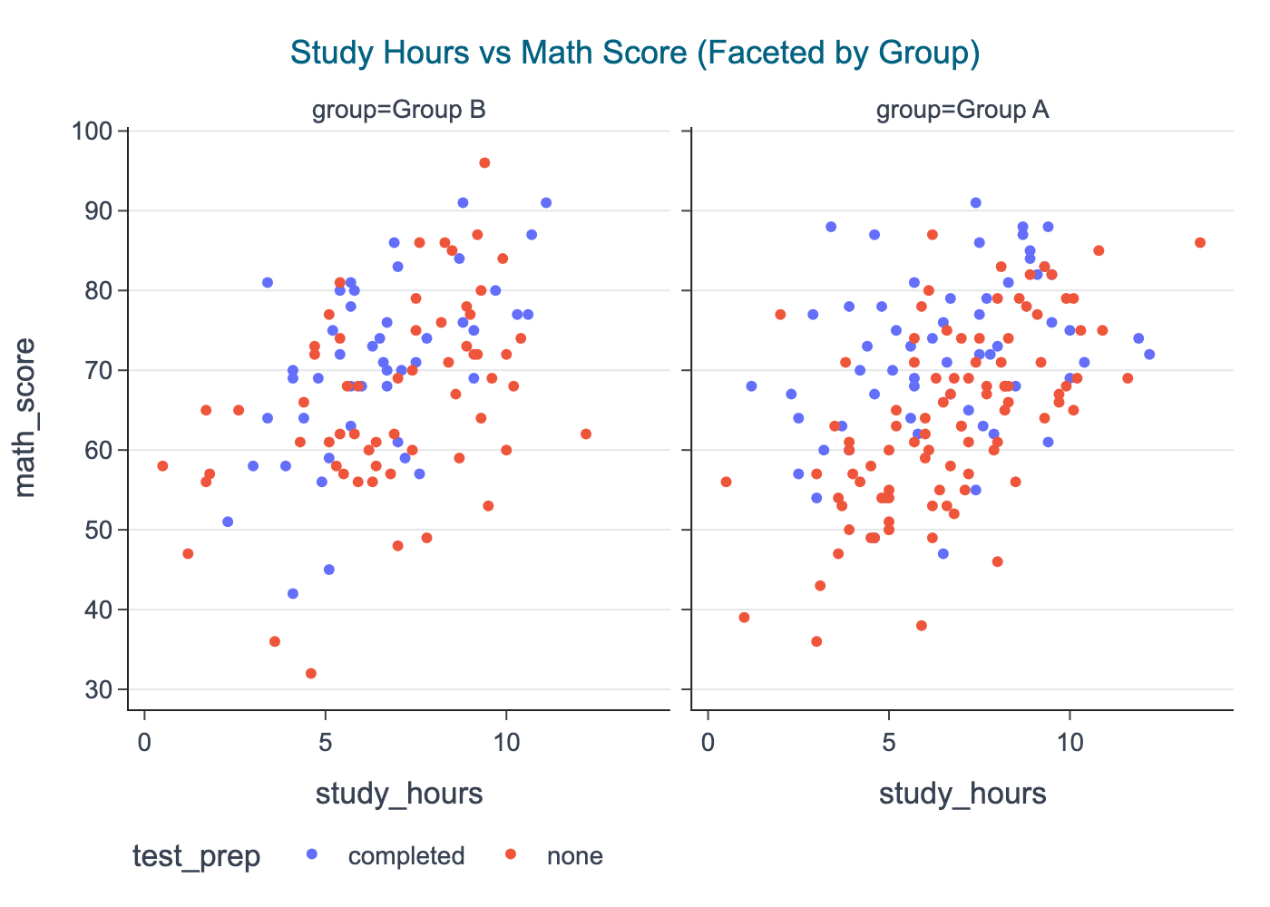 import plotly.express as pxfig = px.scatter( df, x="study_hours", y="math_score", color="test_prep", facet_col="group", title="Study Hours vs Math Score (Faceted by Group)",)# Center title by default; keep export stablecdi_theme(fig)show_and_save_plotly(fig, show=False) # figures/07_005.png