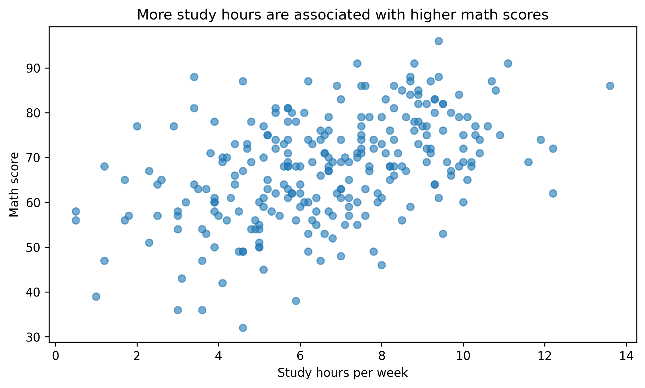 fig, ax = plt.subplots(figsize=(7.6, 4.6))ax.scatter(df["study_hours"], df["math_score"], alpha=0.6)ax.set_title("More study hours are associated with higher math scores")ax.set_xlabel("Study hours per week")ax.set_ylabel("Math score")fig.tight_layout()show_and_save_mpl(fig) # figures/10_001.png