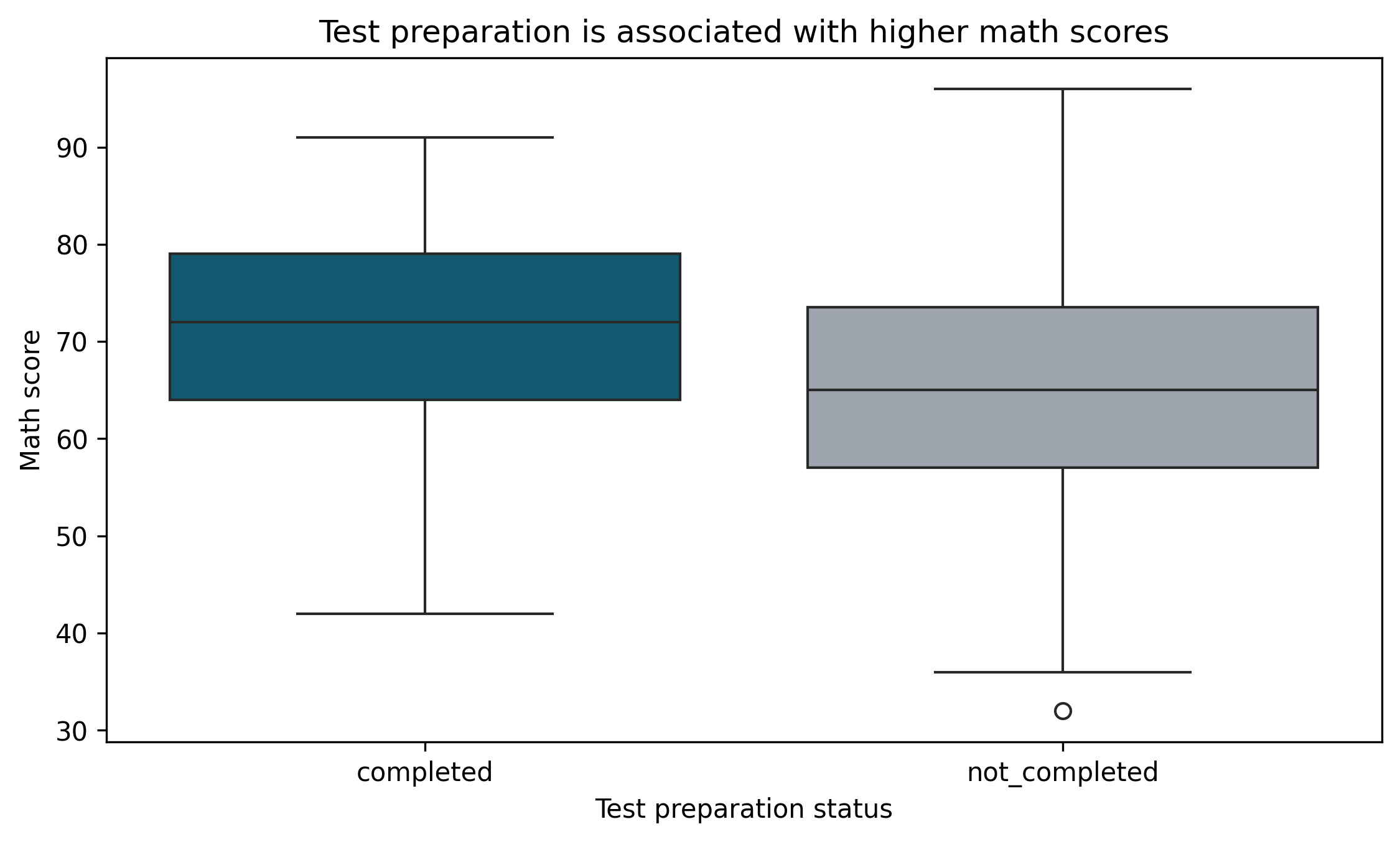 palette = {"completed": "#036281","not_completed": "#9CA3AF",}df["prep_label"] = df["test_prep"].map({"completed": "completed","none": "not_completed"})fig, ax = plt.subplots(figsize=(7.6, 4.6))sns.boxplot( data=df, x="prep_label", y="math_score", palette=palette, ax=ax)ax.set_title("Test preparation is associated with higher math scores")ax.set_xlabel("Test preparation status")ax.set_ylabel("Math score")fig.tight_layout()show_and_save_mpl(fig) # figures/10_002.png