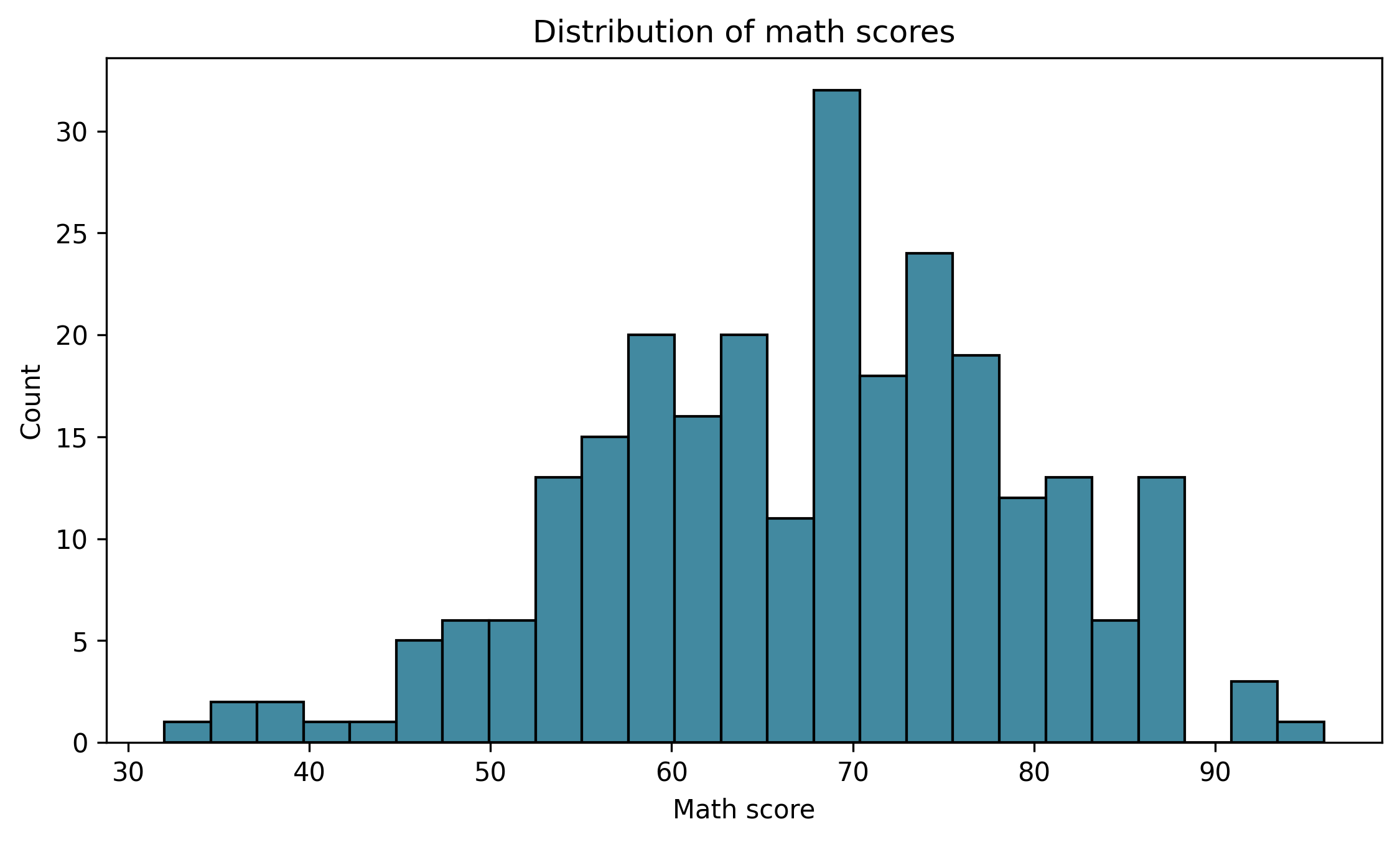 fig, ax = plt.subplots(figsize=(7.6, 4.6))sns.histplot(df["math_score"], bins=25, color="#036281", ax=ax)ax.set_title("Distribution of math scores")ax.set_xlabel("Math score")ax.set_ylabel("Count")ax.grid(False)fig.tight_layout()show_and_save_mpl(fig) # figures/10_003.png